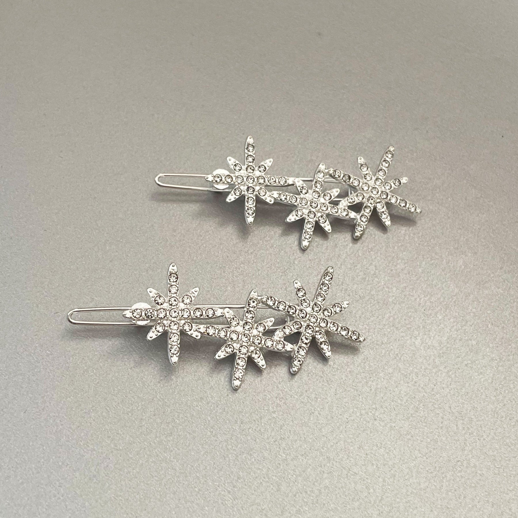 These unique silver tone hair clips, featuring jewel studded stars, are perfect to add some sparkle to your outfit. Pair with our Aura Crystal Silver Starburst Earrings for the perfect combo!