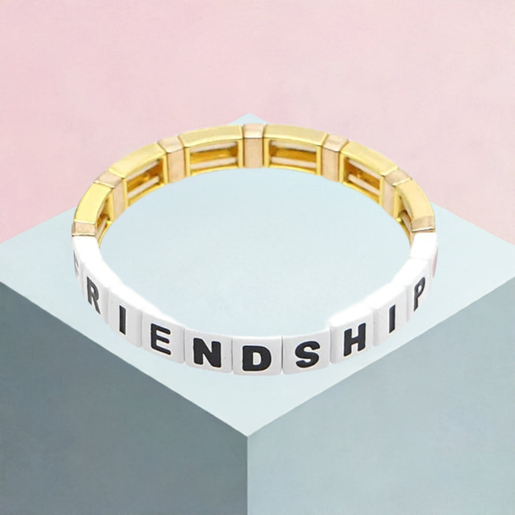 Spruce up your wrist game with our "FRIENDSHIP" Tile Enamel Bracelet in White/Gold - perfect for stacking and showing off your fun side! Elasticated for all sizes and comes in a branded jewellery pouch. Spread the love (and style) with this playful piece.