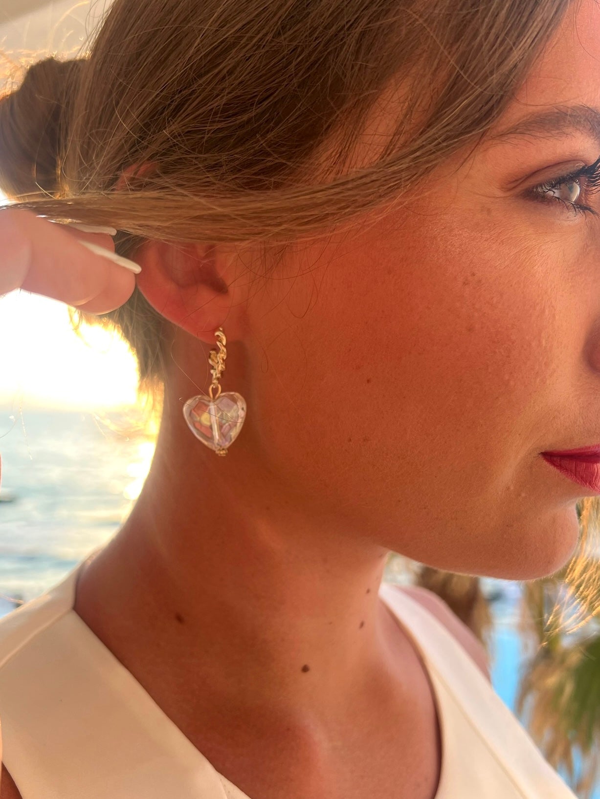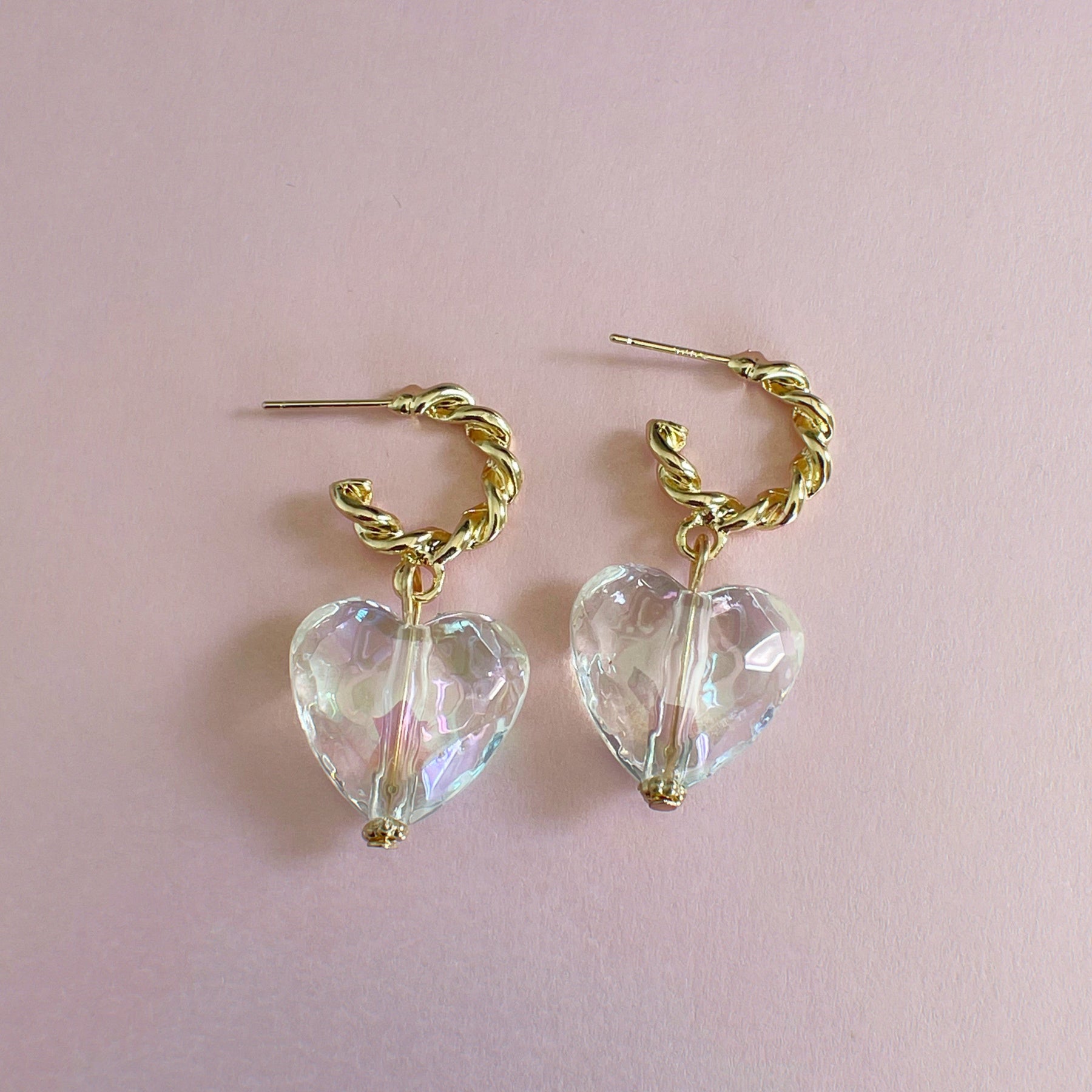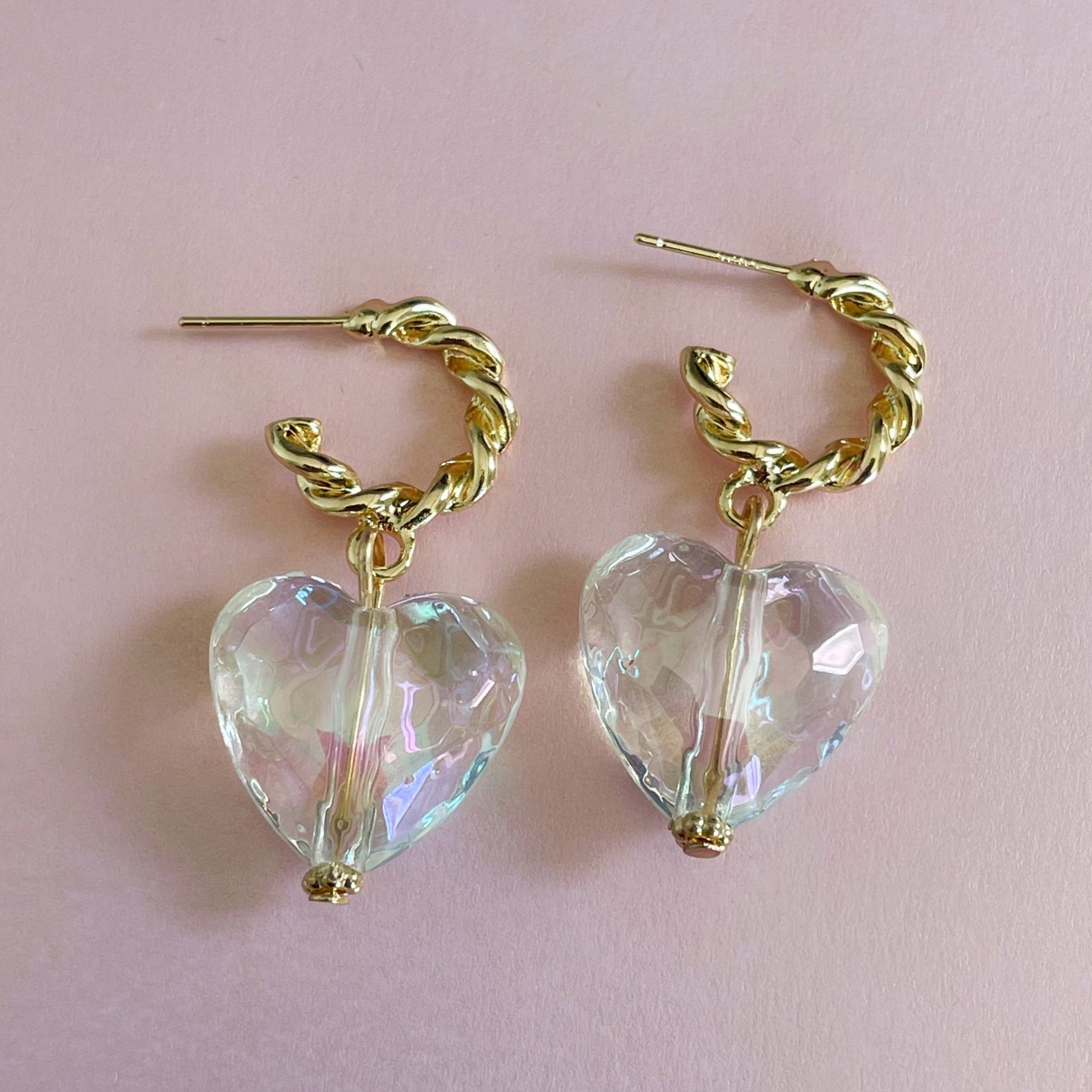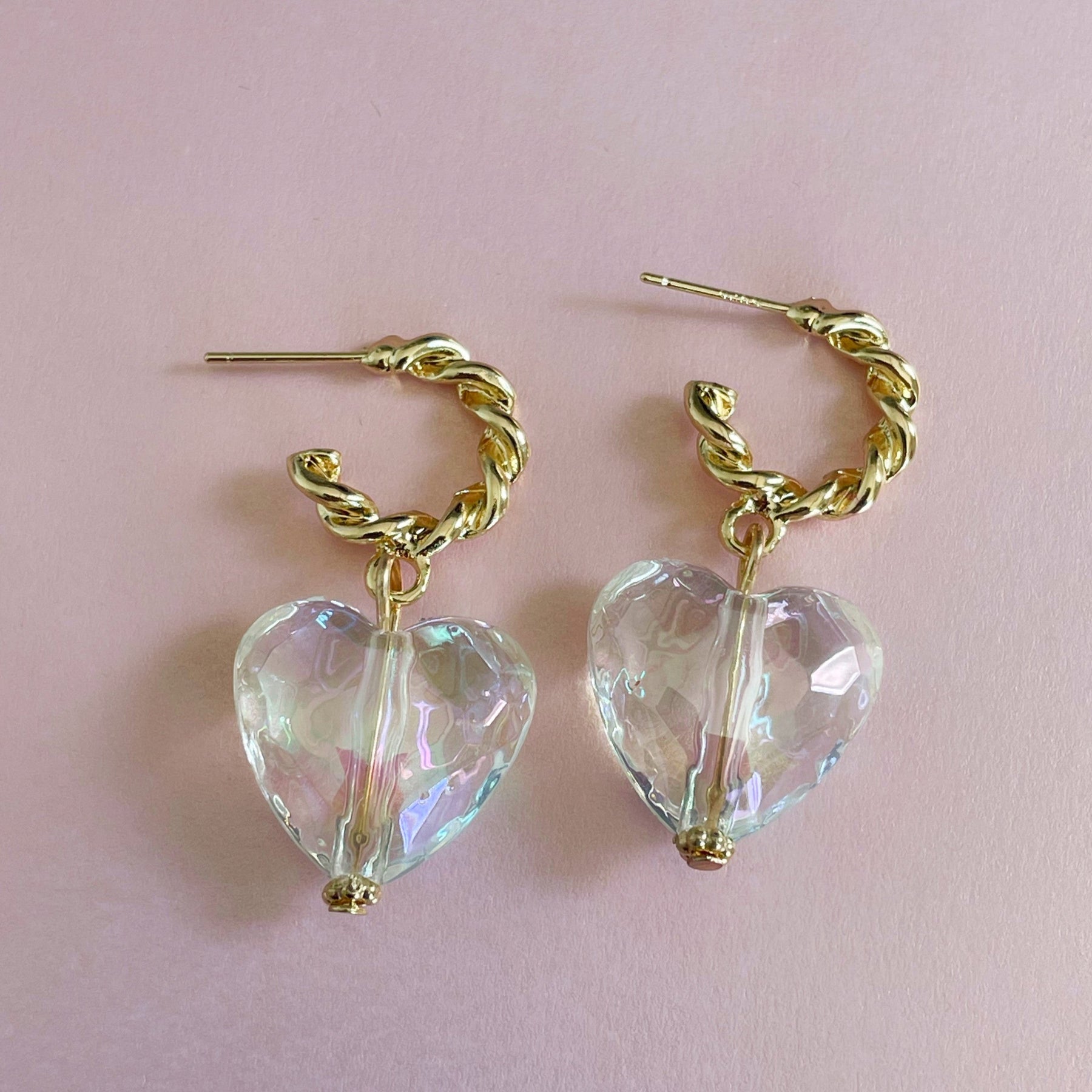 These stylish Taja Heart earrings are the perfect way to make your look shine! The twisted gold half hoop and the faceted iridescent acrylic heart are the most gorgeous combination to add some sparkle to your look.