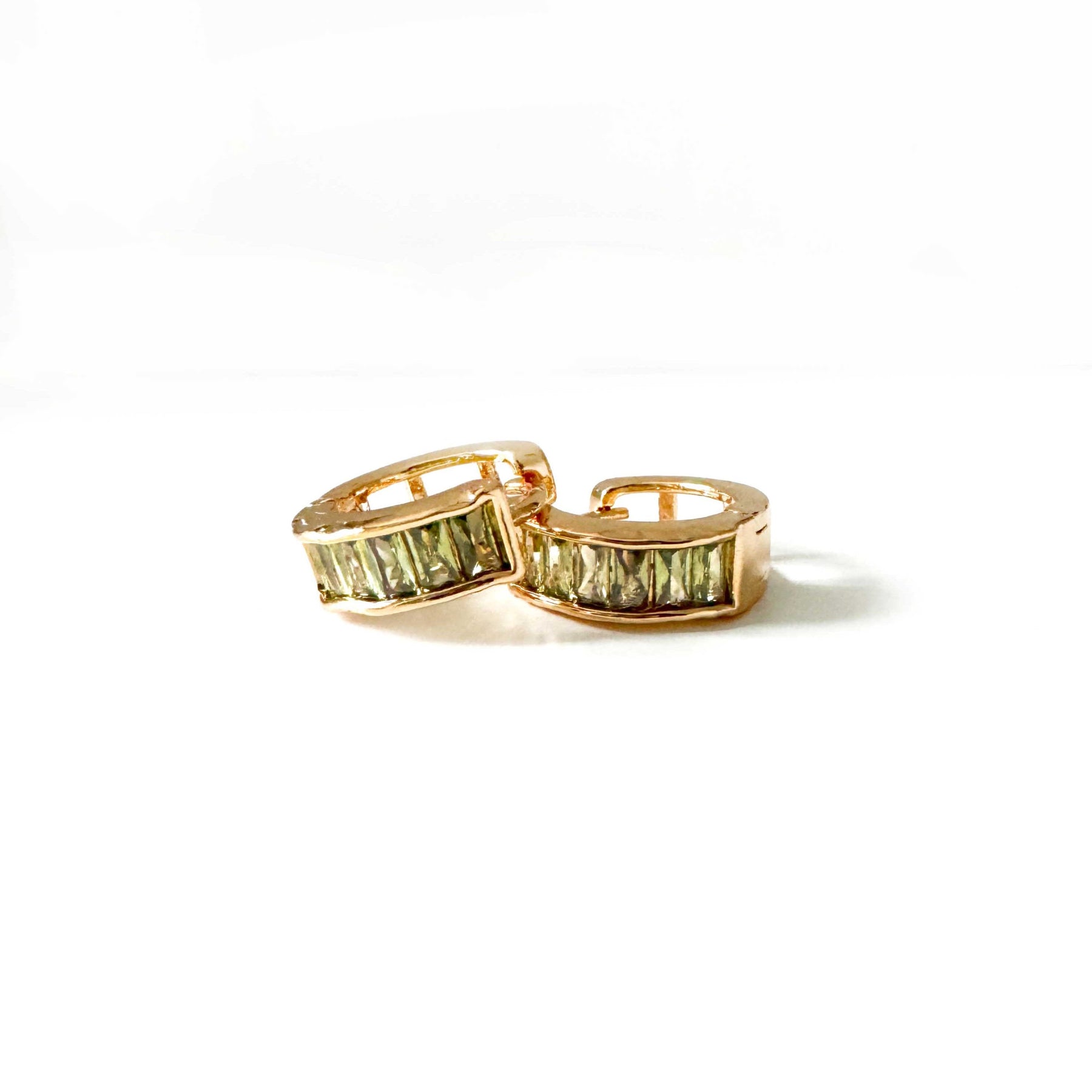 Our Emmie Green Multi Jewelled Hoop Huggie Earrings. Encrusted in gorgeous chartreuse green gems that tightly hug your ear, these earrings add an elegant touch finish to any outfit.