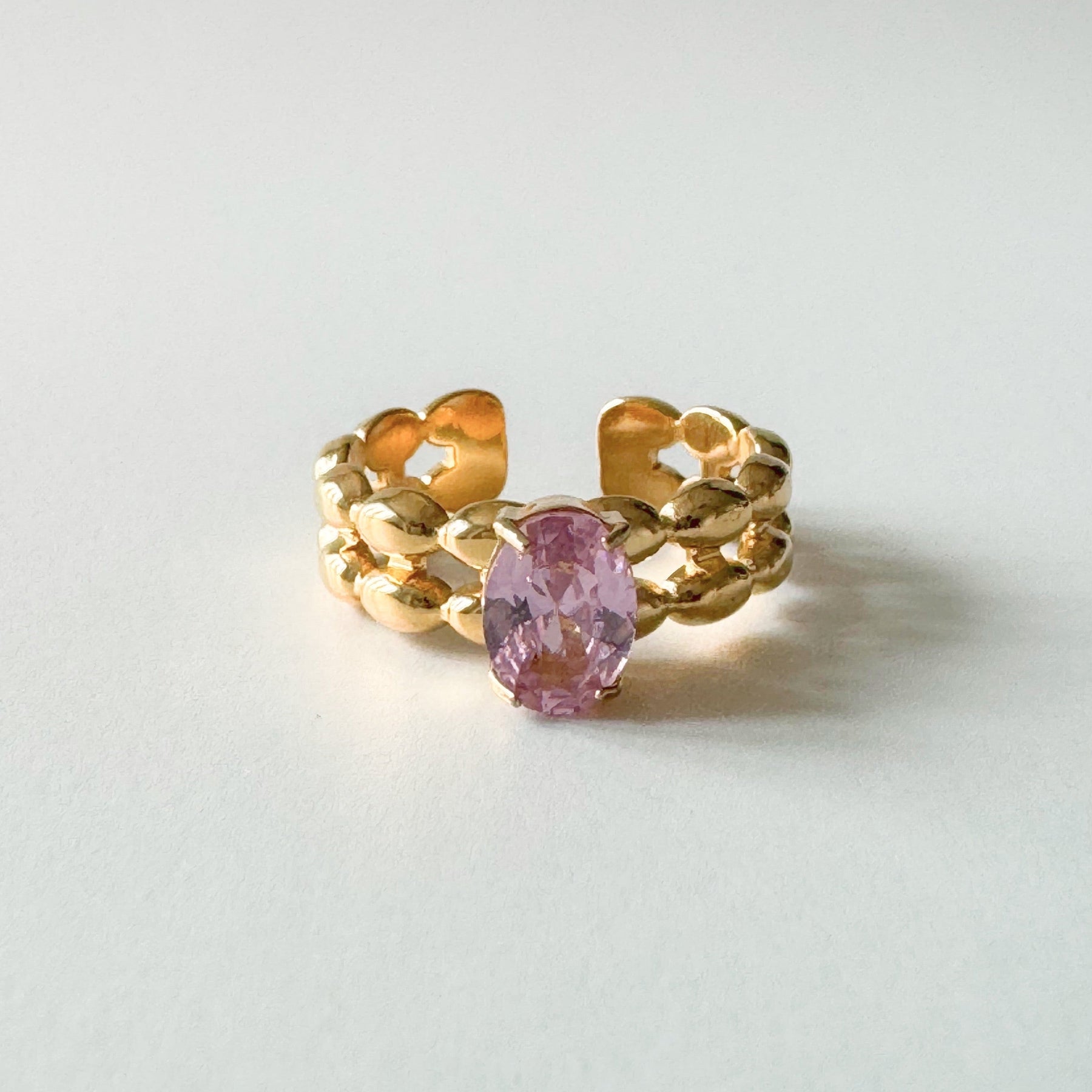 Indulge in luxury with the Rhiannon Luxe 18k Gold Plated Ring. Adorned with a beautiful pink stone, this ring adds a touch of sophistication to any outfit. Elevate your style and make a statement with this exclusive piece.